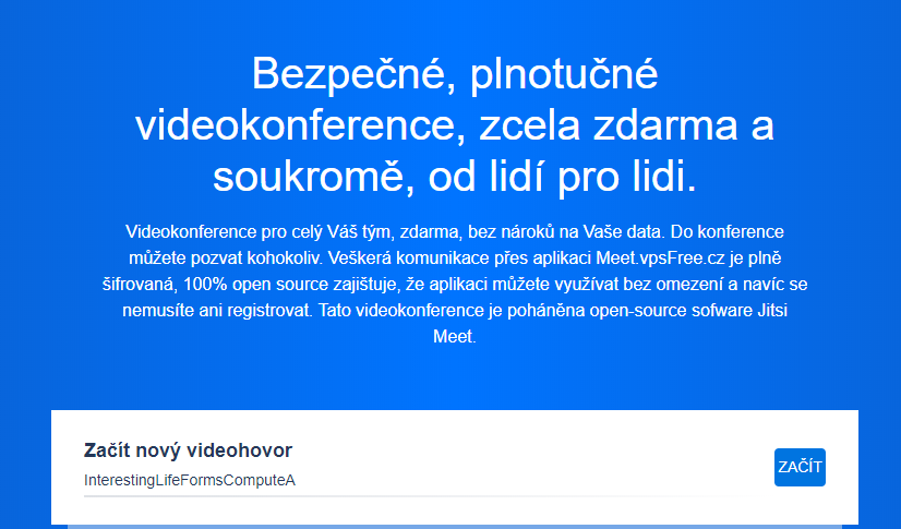 Nebo ještě rychleji – do prohlížeče zadáte do adresy https://meet.vpsfree.cz/COKOLIV (za cokoliv si dosaďte například ,,skodapraha3″ a skupina se vytvoří okamžitě. Odkaz vezměte, a pošlete všem, koho chcete potkat online. Jediné, co musejí účastníci udělat, je přejít na stránku a odklepnout, že v prohlížeči schvalují mikrofon a/nebo video. Takže, například krajský úřad v Liberci si do prohlížeče zadá https://meet.vpsfree.cz/uradkrajliberec a má hned vytvořenou skupinu okamžitě pro všechny kdo adresu znají. Toto by měl zvládnout opravdu každý. Jediné co nevíme je jak se bude služba chovat, pokud se do 1 místnosti přihlásí několik desítek účastníků. Proto doporučujeme u větší skupiny lidí (třeba školní třída) v případě potíží rozdělit kolektiv třeba na dvě části. Svoji vlastní místnost si tak může udělat každá kancelář, projektový tým, třída, učitel …
